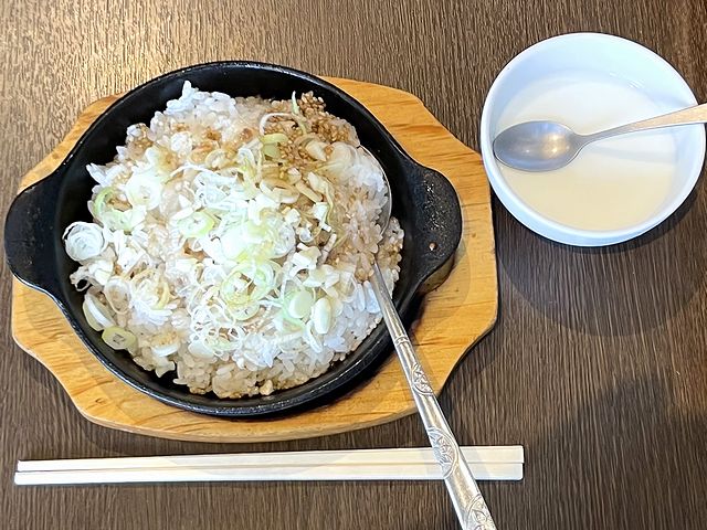 こちらのお店(というかラーメン天華グループ)ではお馴染みの鉄板焼き飯ですが、これは初めてお目にかかるタイプ。口に入れれば、背脂と刻みニンニク、ネギとタレが合わさった香りが口の中に広がり、その匂いだけで、もう。タレの味加減も申し分なく、ジャンクな味わいがたまりませんね。