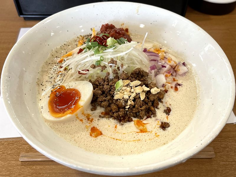 それで早速スープからいってみたところ、第一印象は泡のお陰かクリーミーな感じがありまろやか。しかしながら、その後から、いろいろな風味や旨味が出てくるというか。旨味的には何の出汁でしょうか?私の舌では一回味わっただけでは見当も付きませんが、くどくなく攻めすぎないベースという印象。そこに、ナッツの香ばしさや唐辛子などの辛味、ネギ類のフレッシュな葷の風味、あと忘れちゃならない味のしっかりした肉味噌(そぼろ)などが賑やかに味を作り上げるものの、全体の印象としても散らからずくどくなく攻めすぎないというか、しっかりと節度のある味わいに感じます。ちなみに辛さは結構強めというか、辛いものが比較的得意な筈の私も、しっかりと辛いと感じました。もっとも、これも辛過ぎはせず、十分に味わっていただける範囲だと思いますが。
