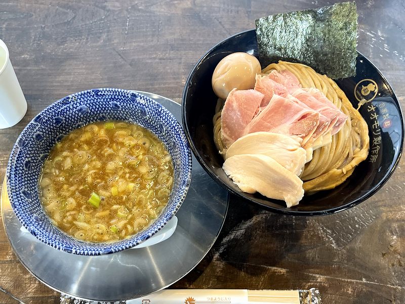 その店内は思いのほか広く、イマドキのラーメン屋さんらしくお洒落。注文は食券制で、つけ麺(鶏つけそば)と鶏出汁のラーメン(鶏そば)がメインと聞いていたのですが、海老つけそばやまぜそば、更には栃木県では貴重な台湾まぜそばなどもあり、種類が豊富ですぐには選べないほど。そんな中、後客も来たので早く決めなきゃと焦って買ったのが、上鶏つけそばの食券。店員さんに席に案内され食券を手渡す際、つけ麺は麺量を無料で増やせるとのことだったので、欲をかいて中盛りにしてしまいました。