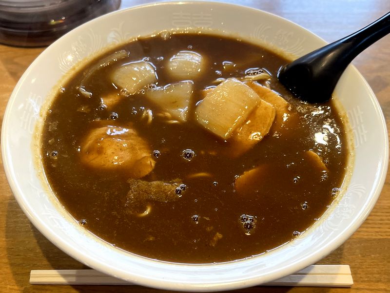 店頭にバイクを停め、早速入店。外観からして最近リニューアルされたようで、とてもきれいな店内はテーブル席のみで、結構コンパクト。で、ラッキーにもそのうち1つが空いていたのでそこに案内され(その後、入店待ちも出来ていました)、お品書きを見たところ、決してカレーラーメンだけではないというか、懐かしいラーメン屋さんというラインナップ。こちらで出されている、当地の昔からある中華そばも気になったものの、初志貫徹でカレー中華をお願い。程なくして登場しました。