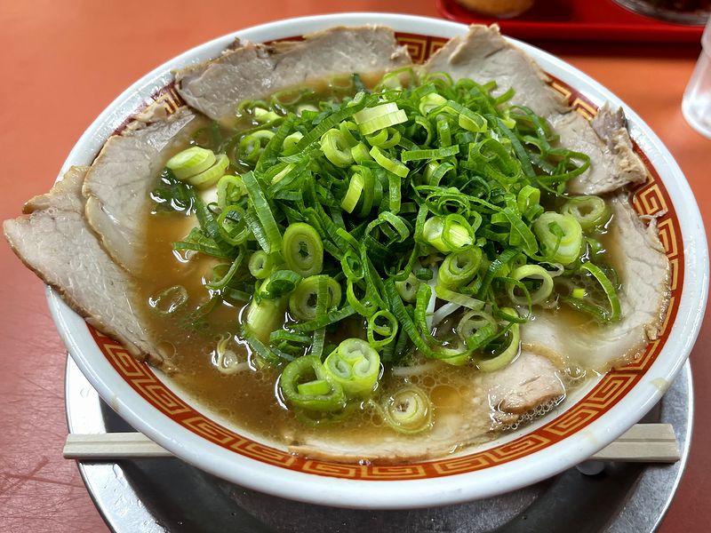 その登場した中華そば。丼の周囲に並べられたチャーシューと、中央部にこんもりと盛られた青ネギというビジュアルが特徴的ですね。