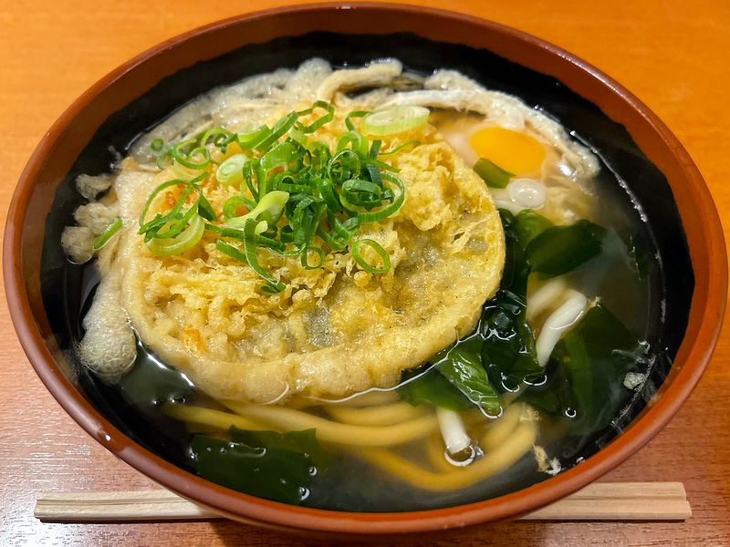 それでこちらのスタミナうどん。具材はかき揚げと玉子の他、きざみ揚げにワカメと、4種類。お値段を考えるとかなり(かき揚げと生玉子だけでも単品合計210円なんです。)お得で嬉しいですね。