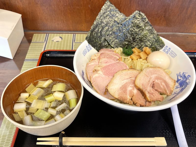 それで、朝涼しいなかを走ってきたこともあって温かいラーメンに惹かれたものの、こちらのお店では初めてとなるつけ麺が気になり、塩味、大盛りでオーダー。チャーシューや味玉が増える特製まで付けちゃいました。