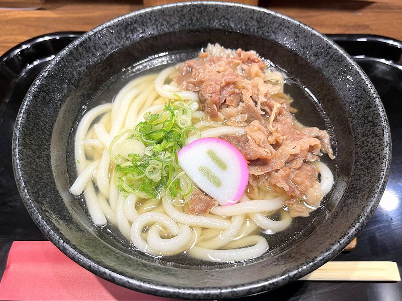 注文は食券制ではなく、店員さんにオーダー。天ぷらがかき揚げではなく、しかも揚げ置きではないなど、いわゆる駅うどん・そば店よりはちょっと高級な気がしますが、メニューには麺2玉の学生うどん・そばもあるなど庶民的なところも。また午後5時以降はツマミ類も充実しているようですが、ここは一杯と言ってもうどんをいただくことにします。ちなみに、お店のおすすめは、複数種の天ぷらなど具だくさんでお得な大仏うどん・そば(1,000円)だったのですが、このあと、何食わぬ顔で夕食をいただくため重い天ぷら系はパスし、さりとて素うどんでは寂しいので個人的に関西に来るとよくいただく肉うどんをお願いしましたが、何と牛肉は当地の国産牛を使用しているようです。