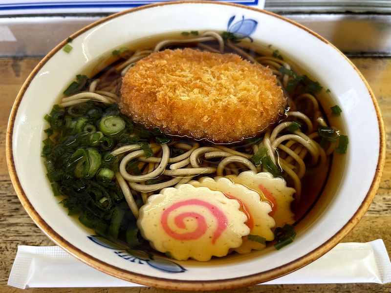 それで何故今回、実はこのために新幹線まで乗って三島駅にしたのかという答えが、今回いただいく「みしまコロッケそば」。みしまコロッケとは、富士山西麓で採れたメークイーンを使ったご当地グルメで、実は御殿場駅や沼津駅の桃中軒でも扱っているらしいのですが、せっかくなので三島駅まで来た次第。