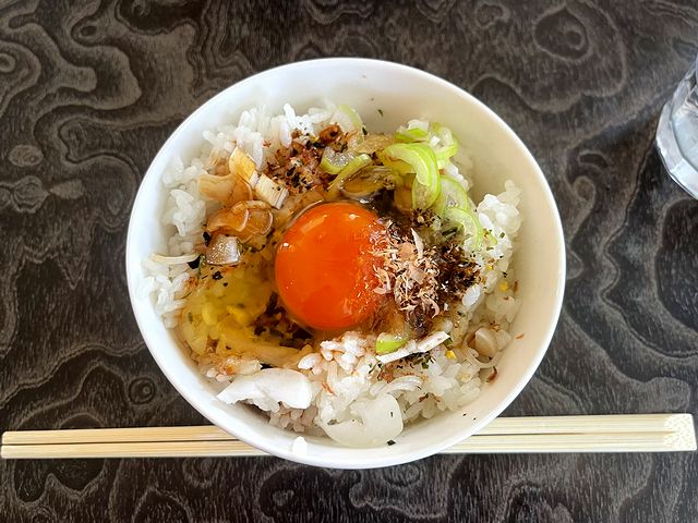 で、タレや節粉、薬味のネギなどが予めかけられているので、よく混ぜてからいただくと、それらが見た目通り濃厚な卵、そしてご飯と絡まって、これが、また。ラーメンと一緒だと胃の容量的に正直食べ過ぎなのですが、それでもスルスルっと入ってしまう美味しさです。