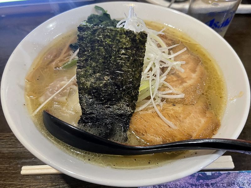 それで今回は、前述のとおり「コク旨塩」が食べたいということで、注文用のタブレットで探すも、お伺いしない間にメニューの並びが変わったこともあってなかなか見つからず。その後、「常連さんのメニュー」というというタブにあったのを無事発見し、いつもはネギラーメンでいくところを今回はワンタンメンを注文。家人も今回はあっさりピリ辛みそのワンタンメンを注文したところ、ちょうどワンタンが切れてしまったとのことで、まずはワンタンが1粒だけ載った状態で出てきて、その後、茹でたて熱々のものが3粒、別の器で登場しました。(1粒おまけしてくださった?)