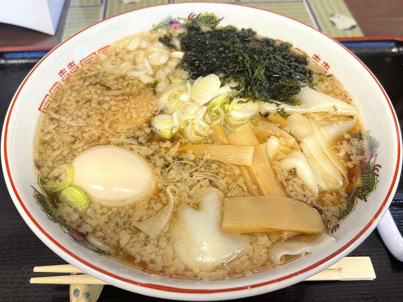 それと具は、ホロトロ系のチャーシューが一枚に、濃くない味付けが良いメンマ、白ネギと先述のタマネギ、バラ海苔が標準で。そして追加した味玉は、白身、黄身共に柔らかく、味染みも適度。更に今回の白眉は肉わんたん。ぺろんとした食感の大ぶりの皮に、名のエノとオリ肉メインの餡が食べ応え十分。雷鳥のスープともよく合いますね。
