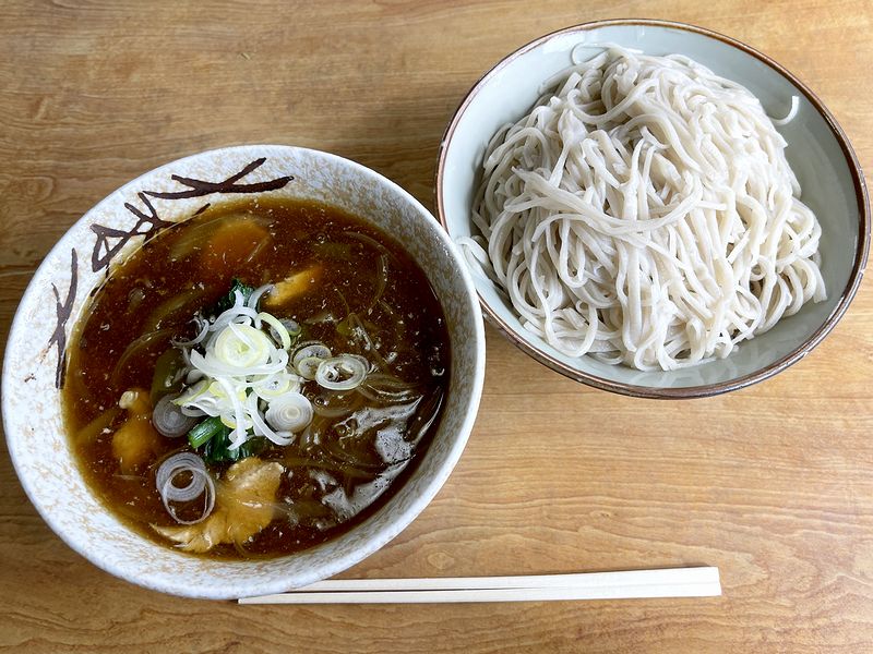 次に、先述のつけ汁にそのソバを浸けていってみたところ、これが!つけ汁は透明なれど、スパイシーというか、しっかりとしたカレー感があり、出汁の旨味や味の濃さもバッチリ。結構トロミも付いているんですね。更に驚いたのが、これほどまでにカレー感のあるつけ汁にもかかわらず、蕎麦の香りがちゃんと感じられること。これが和風なカレーと良く合って、もう。更に、熱々のつけ汁に冷たく締められたソバを浸けることによって、口に入れやすい、味わいやすい温度になるのも良く、何というか、目からウロコが落ちまくったというか。
