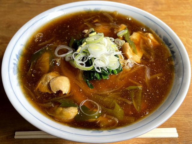 また具は、上に載せられたホウレン草の他、ツユの中には鶏肉とタマネギ、長ネギと、こちらの鳥(そば・うどん)と同じ構成。ひょっとして、ベースが鳥(そば・うどん)なんですかね。(美味いからどうでもいいですけど。)