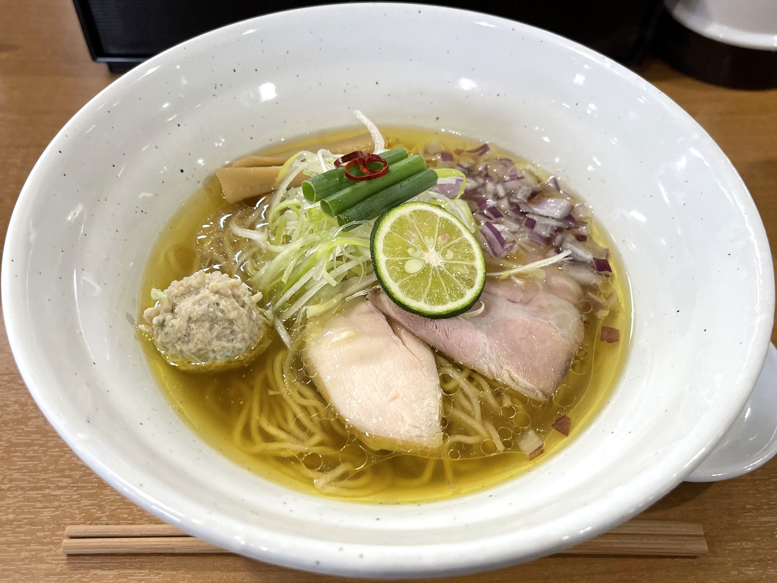 登場したら早速、名前の通り金色のスープからいってみると、鶏の風味と旨味がじんわぁ~っと。無化調的風通しの良さは相変わらずですが、以前いただいた時も鶏がこんなに力強かったっけか、と。また味付けも塩気のアタックがまろやかないい塩梅で、更に、スープがうるさくないため薬味が生きるというか、青ネギは意図的につままないと口に入らないけど、それ以外は、鷹の爪の辛味と香り、紫タマネギの瑞々しさ、白ネギの葷の風味がランダムで口に入り、一口ごとに表情を変えるよう。更に途中からスダチを絞れば、この爽やかな香りと酸味が、とても良い味変になります。