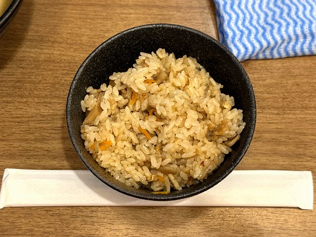 こちらは、一緒にいただいた品。関東の人間からすると馴染みのない「かやくごはん」という名前ですが、要するに炊き込みご飯のこと。また中身は季節ごとに変わるようで、現在は五目ご飯となっています。