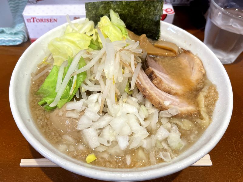 具は、厚めに切られた2枚のバラチャーシューがメインですが、それよりも薬味系の生タマネギのことを語りたいというか、煮干しと背脂にこれほどまでに合う薬味はないですね。あと、海苔も良く合うというか、今度は海苔増しにしようと思いつつ、食券を買うのを忘れてしまったという。