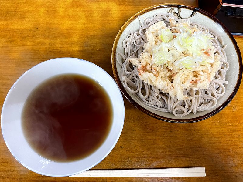 それとかき揚げは、かなりクリスピーで、ツユに投入したてはまだサクサク感が残っています。しかしツユとの馴染みは良いので、急速に一体化。それでも溶けるようなことは無いんですが。ちなみにタネは当地らしく玉葱と桜エビ様の小エビかと。