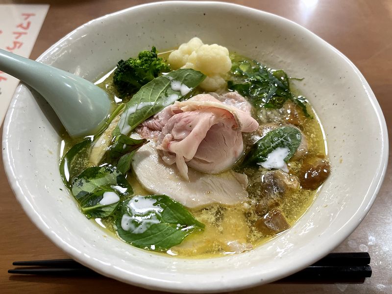 提供された時、とても美しいというか華やかな盛り付けにちょっと驚いたのですが、まずはスープからいってみたところ、これが、もう!ベースは鶏でしょうか?そこにポルチーニ茸っぽいキノコの旨味、更に乳脂肪的なコクのある旨味などが加わって、とても立体的な味。しかも、無化調とあって、風通しの良さも兼備された、何とも心憎いスープじゃありませんか。それと、個人的には風味的にキノコの主張が強すぎないのも良いとも思ったのですが、きのこ類がどちらかというと苦手な家人が味見したところ「きのこの風味が凄い」との感想。このあたりは、食べ慣れ具合で受け取り方が変わるものなんですね。