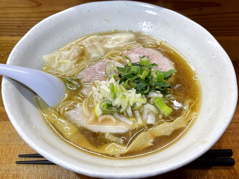 それで今回は、前回の訪問時に「シンプルな品もぜひいただいてみたくなった」というわけで、朝ラーメニューから中華そばを醤油味で。ただ、この日は限定でブラックタイガーの海老わんたん麺が提供されており、ワンタンのみの追加も可能とのこと。店主さんのおすすめでもあったため、トッピングで追加しました。