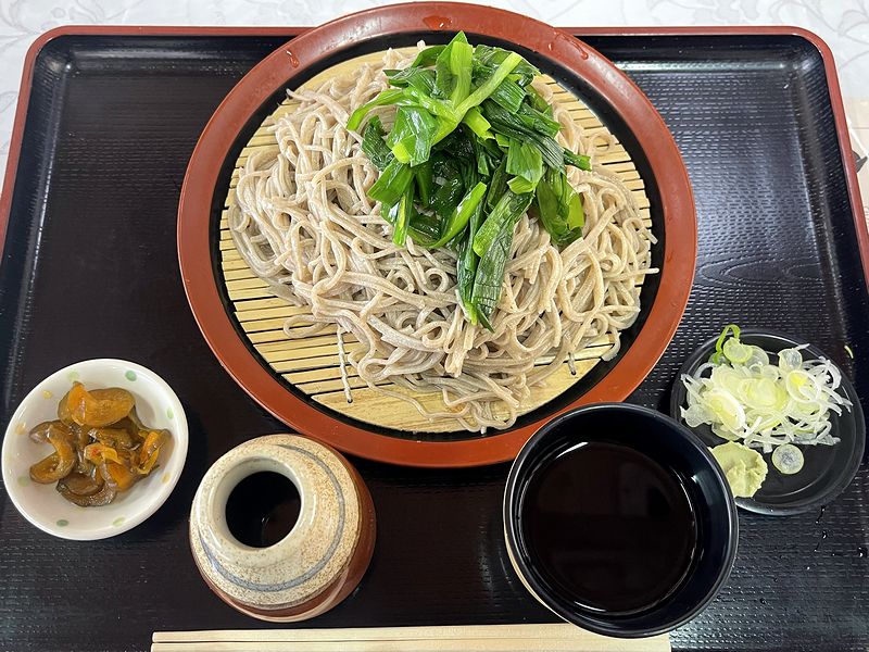 それにしてもこちらのお店。特に下調べせずに来たのですが、まず、場所が粟野川沿いの山が迫ったとこにあって、バラックっぽい外観も趣がありますね。で、お店の前にはいけすというか釣り堀のようになっていて、お店の軒下には釣り竿が何本か立てかけられていました。(このときは誰もそこにいませんでしたが、帰る頃には釣りしている人が。)それを眺めつつ店内に入ると、先客が数組。店内は、殆どが座敷席で、場所によっては粟野川が眺められたものの、ブーツを脱ぐのを億劫がり、1つだけあったテーブル席へ。早速、愛想のいい店員さんがお茶を出してくれると共に注文を取りに来たので、今日の目的であるニラそばの大盛りと、お品書きを見て気になったもう一品を注文。奥の厨房から聞こえる音に耳を傾けつつ、さほど待たずに登場しました。