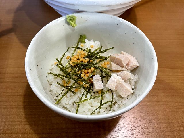 それで麺を啜り終わったあとは、残ったスープをお茶漬け用のご飯に注ぎ入れ、わさびを溶いてズルズルっと啜れば、これが、また!あられが香ばしく、海苔とワサビの風味がそれだけで十分お茶漬け感は出ているのに加え、具として鶏肉が入っているのが嬉しいところです。