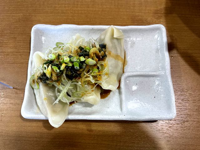 で、茹でることによってもっちりとした食感となる皮に、わりとジューシーでプレーンな味わいの餡が包まれているのですが、個人的に最大のポイントに感じたのは、ネギたっぷりの味噌ダレ。(令和4年2月13日追記というか訂正。注!店主さんによると、醤油ベースで味噌は使っていないそうで。いやはや、私の舌も当てになりませんなぁ。)白ネギのフレッシュ感と、青ネギは揚げてあるのでしょうか?香ばしさもあるような。そして、それらに加えてニラやニンニク的「葷(くん)」の風味が強すぎず効かされていて、味噌の(だから、味噌は使っていないんですって!)強めの味と相まって、味わう上で適度な引っかかりとなっているのが心憎いなぁ、と。