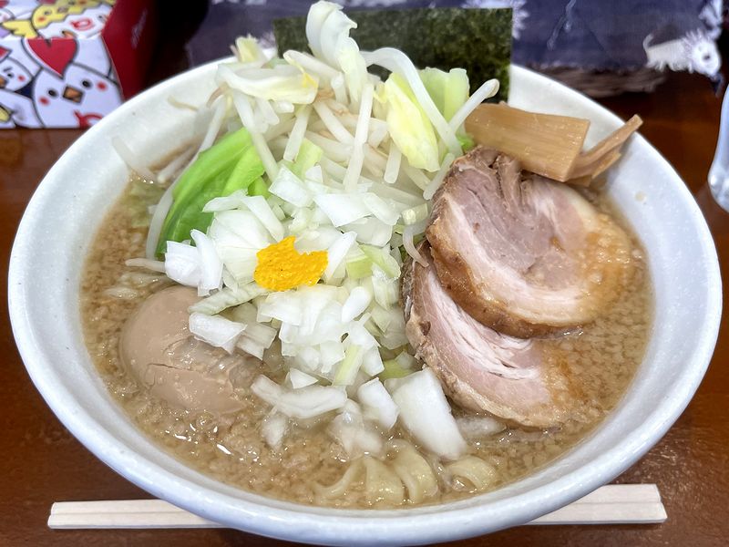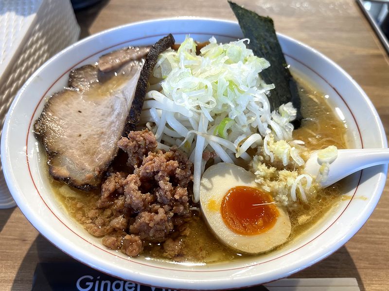 パっと見たところ、中央にモヤシ、その上に白ネギの輪切りが載り、その周りを(写真では殆ど写っていないけど)メンマ、海苔、おろしショウガ、味玉、ひき肉、チャーシュー達がぐるりと取り囲んでいます。