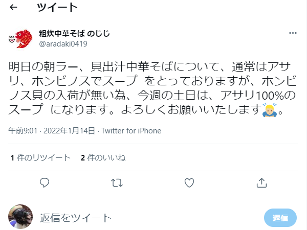 先日、朝ラーで貝出汁中華そばという品をいただき、その「二枚貝っっ!!」というべき味わいに衝撃を受け、近いうちに再度いただこうと思っていたところ、お店の公式ツイッターで、