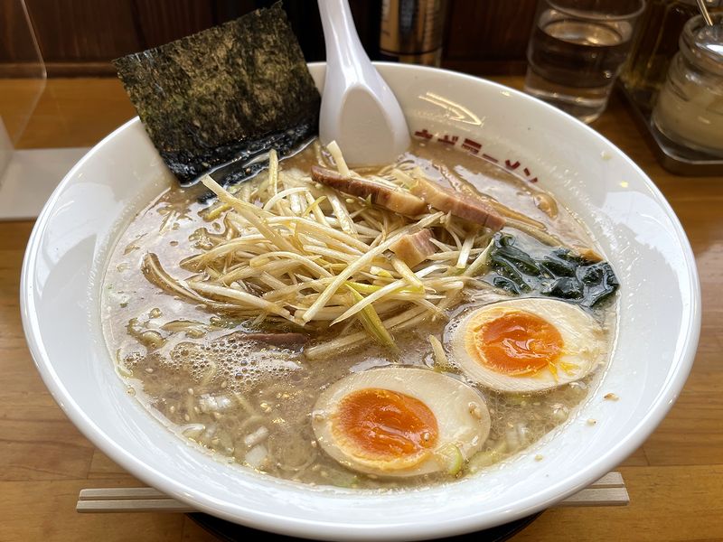 それで今回いただいたのが、ネギ味噌ラーメンを中盛、味玉入りで。食券買う時、背脂入りと迷いましたが、こちらは標準のものでも液体油、背脂とも結構入ってコッテリしているという認識だったので、わざわざ背脂入りにはしませんでした。しかし、程なくして登場したネギミソラーメンは、記憶にあるものとは違って液体油、背脂共に少なめ。確かに、これまでのは標準でもかなりコッテリしていたので、この差別化は大歓迎なのですが、今日は背脂入りにしておけばよかったという後悔も若干あったりして。