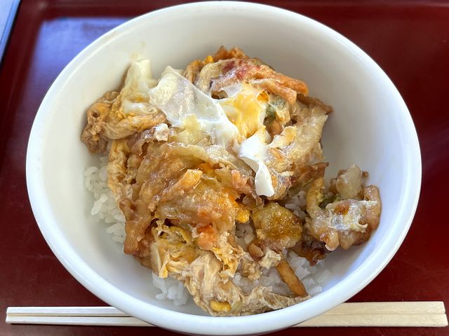山田うどんには、かき揚げをたまごでとじてご飯に載せるという、私の大好きな要素しかないかき揚げ丼というレギュラーメニューがあり、今回はそれをメインにいただこうと思っていたところ。で、山田うどんの公式ウェブサイトにはフルサイズのかき揚げ丼しか載っていなかっのですが、お店でメニューを見たところミニがあったので注文した次第。(うどんをミニにしたとはいえ、+フルサイズの丼ものは、この日の体調的に若干つらかったので。)