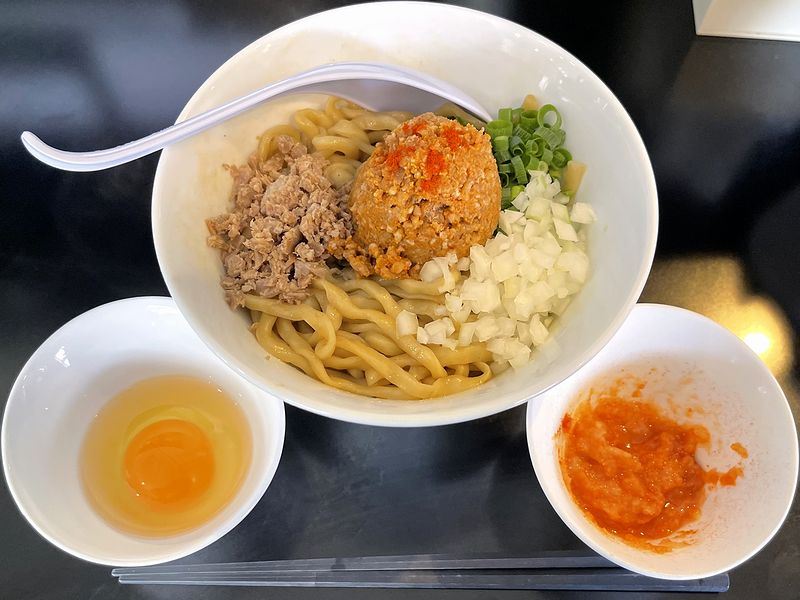 そして一番驚いたのが、その味。混ぜる前の麺の上にはそぼろというか肉味噌的なものや細かく刻まれたチャーシュー?が載っていたものの、見た目的には牛要素がないにもかかわらず、その風味、そしてしつこくない旨味は、「どこにいたの?!」と思うほどめっちゃ牛。以前こちらのお店で「冷鯛(つめたい)油そば」という品をいただいた時も、鯛自体は存在しなくとも鯛の存在感がめっちゃ有るということがあり、今回もそれに続く衝撃だったというか。また味の決め手のタレは醤油ベースでしょうか?甘味もあるけど結構しょっぱめで、追加の生卵あったほうがまろやかさは出ますが、無しで牛のエッジを楽しみたい気もします。