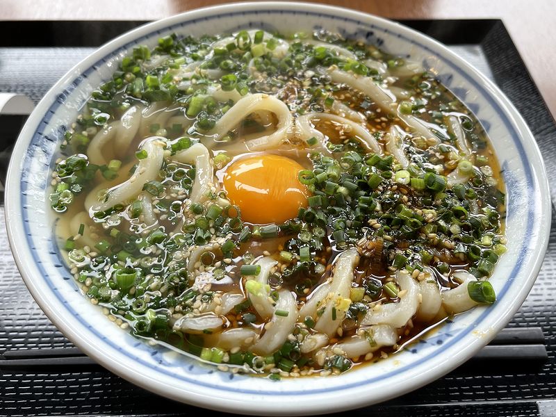 それで今回は、初めてとなる「ねぎ玉」という品をオーダー。かけ(うどん)タイプなのかぶっかけ(うどん)タイプなの写真からは判断がつかなかったのですが、レジで精算の際、レジ脇のツユを注ぐ機械でかけづゆの方を掛けるよう指示されたので、かけタイプの品だとわかりました。