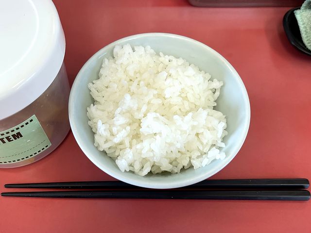更に今回は、っていうか、最近アサカ商事のラーメンショップに来ると必ず頼んでいる気がするライスを、このラーメンをおかずにいただけば、これが、また。加えて、アサカ商事名物のサービスの自家製キムチが、白米に合う白菜になっていたのも嬉しいところ。このキムチをはさみつつ、途中、卓上のおろしニンニクやラー醤(豆板醤的辛味調味料)で味変しつつひたすらラーメンとライスをがっつけば、背脂のお陰かハッピーになると共に、力が漲ってくる気がします。