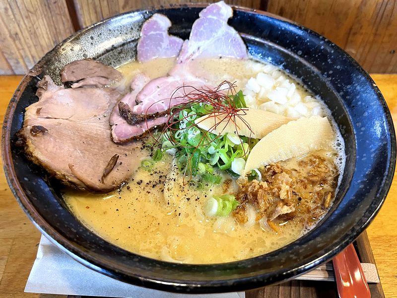早速スープからいってみたところ、口当たりは比較的サラッとしていてスムースだけど鶏の味はしっかり濃いめの白湯に、醤油味も負けずにしっかりと主張しています。また、それだけだと味が単調になりがちなところを、揚げネギ、生タマネギ、青ネギといった薬味類がしっかりとアクセントを加えて、これが、もう。このあたりの味の組み立て方は、心憎いばかりですね。