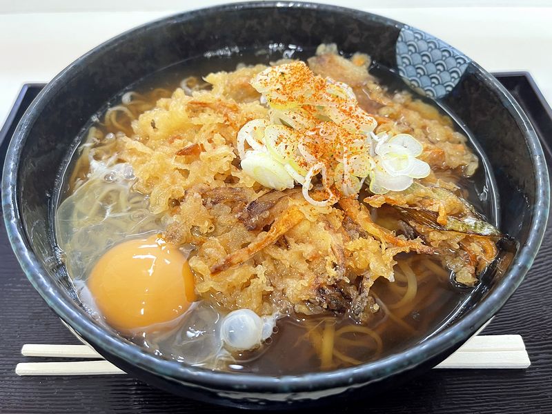 それで今回は、前回いただいたかき揚げそばに玉子をプラスして、いわゆる天玉を。っていうか、レジで注文する直前まで、「今日は生そばじゃなくあえて天玉うどんにしよう」と思っていたにもかかわらず、何故か開口一番「かき揚げそばに玉子入れてください」と言ってしまった次第。