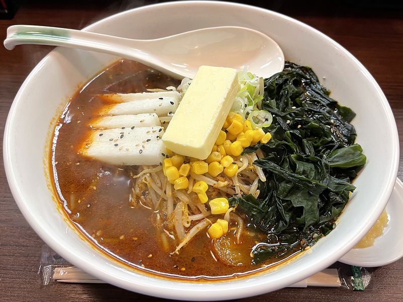それで今回いただいたのは、(辛さ)二番にバターとニンニクを追加して。前回前々回とつい一番辛い三番にしてしまったため、個人的には先代のお店の時から長きに渡って宿題となっていた二番をようやくいただけるかと。(この辺のどうでもいい経緯は、前回お伺いした時の記事に書いてますが。)