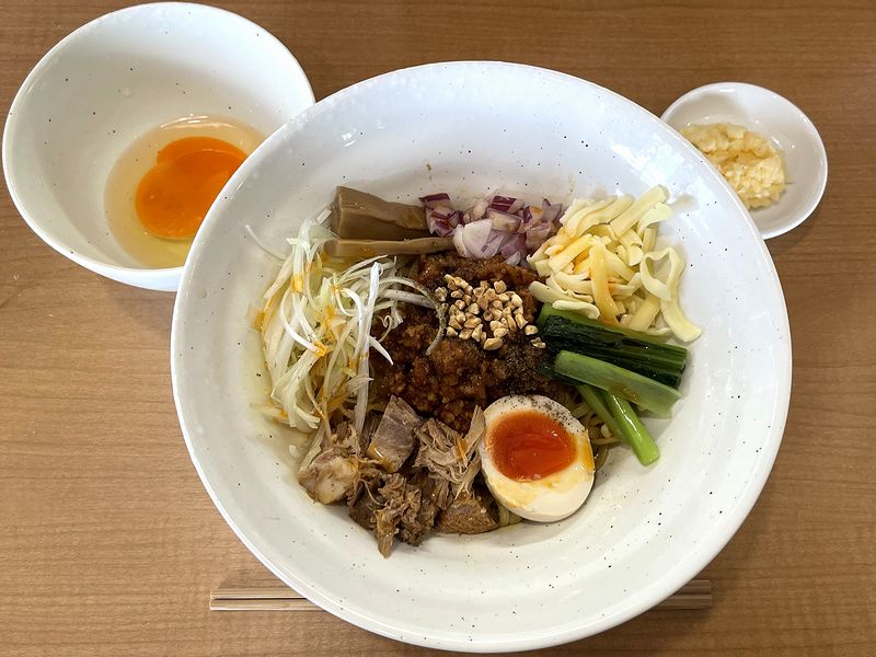 それでその期間限定メニューというのが、こちらの「冠(かむろ)まぜそば」。なんでも、カレー風味のまぜそばとのこと。またお品書きには豊富なトッピングメニューがありましたが、店員さんに、増量となるものと新規追加になるものを確認して、新規追加となる生卵とニンニクを追加しました。