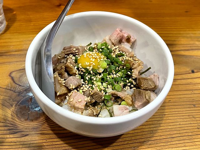 最初に来た時にもいただいていますが、その時同様、小さめの角切りでご飯と一体感が増しているレアチャーシューはもちろん、青ネギとゴマ、うずらの卵?のアクセントに、全体をまとめるあっさりとしたタレが何とも好印象。