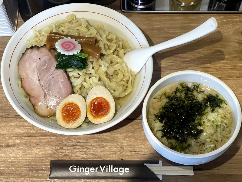 それで今回いただいたのが、昼・よる各限定10食で出されている、和風出汁生姜塩つけ麺を塩味で。元々、未食だった塩ラーメンでもと考えていところ、この日は先日の肌寒さが嘘のように暖かく、更には、ラッキーなことに券売機で売り切れボタンも点灯していなかったということで。