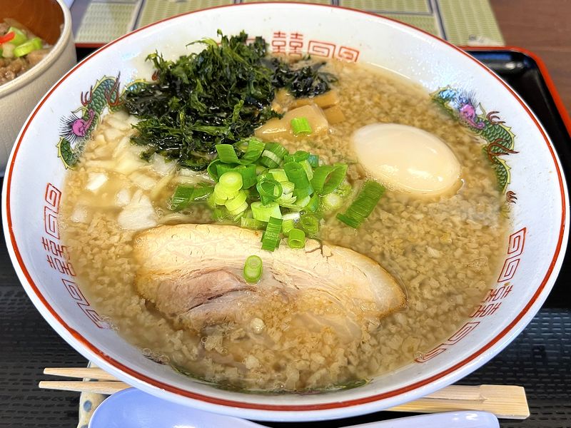 この日は、平日だけど朝ラーな気分だったで、出勤前、午前7時からやっているこちらのお店に。お店には、午前7時を数分ほど過ぎた頃に到着したのですが、近いところの駐車場は空きが最後の1台でしたし、店内を覗くと空席も残りわずか。お昼時や週末の開店直後など激混みなものの、朝は比較的空いていた印象があったのですが、今は平日の朝でもかなり混雑するようになったんですね。