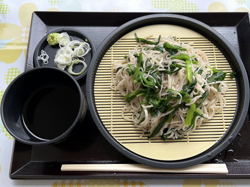 そんな先ほどとは違う静かな環境のなかでいただくべく食券を購入したのが、栃木県日光市のお隣、鹿沼市を中心に当地で食されているにらそば。もりそばの上に茹でたニラが載っているものです。