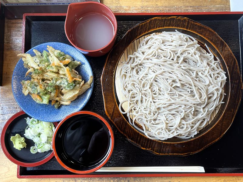 それでお願いしたのは、もりそばに野菜のかき揚げが一つ付くという天もりそばを大盛りで。ちなみに、そばの並盛りは160グラム、大盛りは240グラムとおしながきに書いてありました。そして注文後、厨房からは天ぷらを揚げる音などが聞こえてきて、それが止むと注文した品が登場しました。