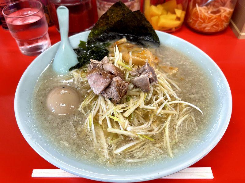 入店してから3ロット目ながら、お兄さん2人による爆速の調理でさほど待たずに登場したのは、個人的にラーメンショップの定番にしているというか、初訪問のお店でいただくことが多いネギラーメン。そこに今回は、味玉を追加して。