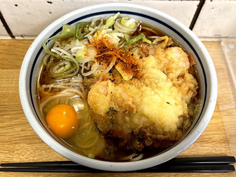 それで店頭の券売機で入店前に食券を購入したのが、「限定15食」の文字に惹かれて、海鮮かき揚げのそばを。ついでにいつものとおりたまごも追加しました。