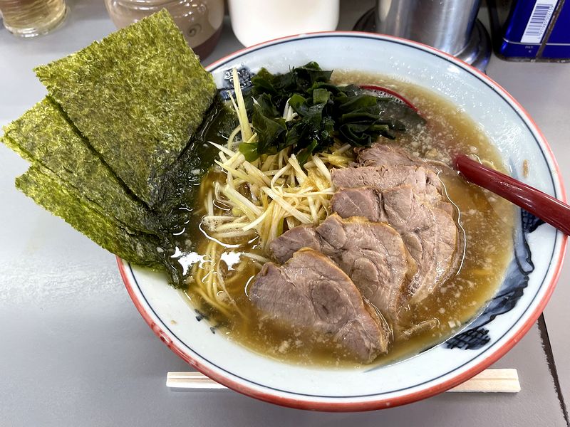 そんな中、私も食券を購入。その店員さんの誘導でカウンター席に座って食券を提出。チョイスしたのは、お店の外に「チャーシューのうまい店」と書いてあったのと、個人的に初めてのラーショでだいたい頼む品(ネギラーメン)を考慮して、ネギチャーシューメンを。