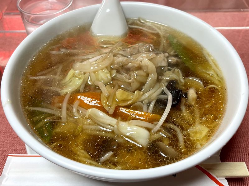 ちょっとだけ離れた駐車場にクルマを停めお店に入ったのは午前11時頃だったのですが、各席に1から2名の先客がいたので、その中の1人客のところに、透明なパーテーション越しに相席に。で、早速注文なのですが、ここでラーメンではなくサンマーメンの定食(半チャーハンとのセット)と、相方のチャーハンをお願い。実はこのサンマーメン。横浜のローカルフードと言うべきラーメンで、私も以前、発祥とされるお店などでいただいたことがあるのですが、あっさりとした醤油味のスープと、上にかかったトロトロの餡の組み合わせがとても良かった記憶があります。