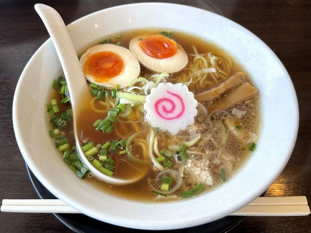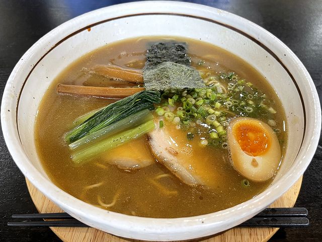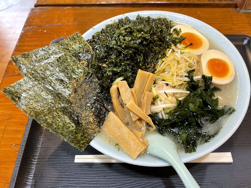 それで今回私がいただいたのが、基本のネギラーメンに、ラーメンショップではそれほど見かけない味玉と、「おすすめ」と書かれたばらのりトッピングを追加して。店主さん手づから持ってきてくださったラーメンは、2品もトッピングを足しているのに綺麗な盛りつけですね。