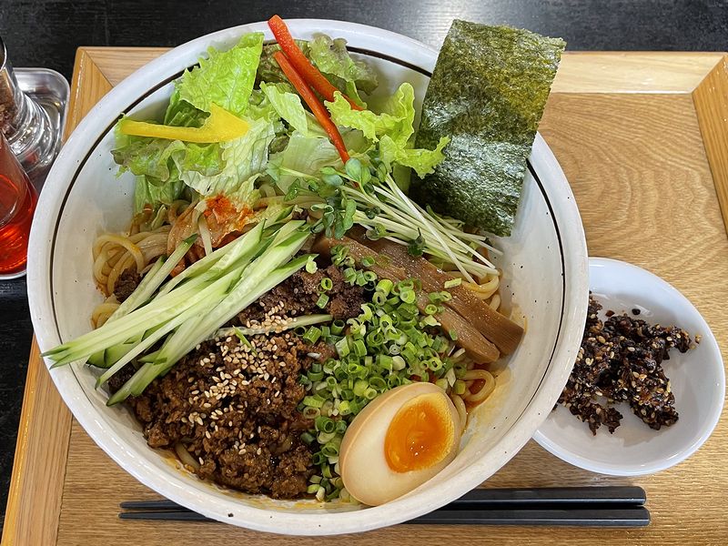 味的には、いい塩梅と共に、冷やし「担々麺」だけあってゴマのまろやかさやこっくり感も感じますが、適度な爽やかさが加わり、そして何より、唐辛子の辛味がグワっと。一口目から結構な辛さということは、食べ進むに連れ口中に辛味が蓄積する=その後の苦戦が予想されるレベルですね。