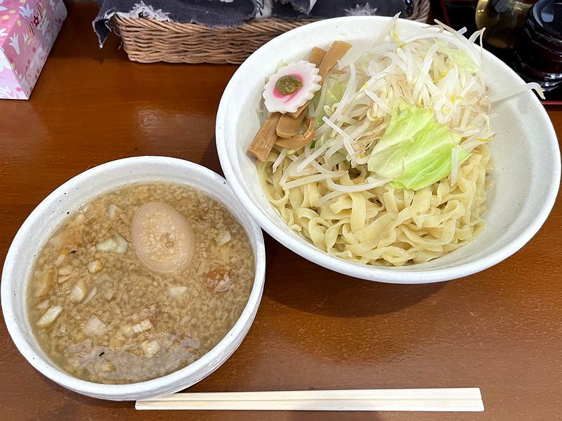 そして具ですが、刻んだチャーシューは正直、つけ汁と一体化という感じですが、あっさりしたメンマは良い息抜きに。それと追加した味玉はいつもどおりの味加減で間違いがないし、キャベツとモヤシを茹でた温野菜は、このつけ汁にもバッチリ合いました。
