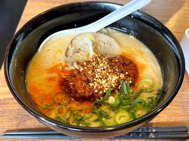 で、最初は、あえて肉味噌は混ぜないで端の方からスープをいってみると、ゴマ感よりも、ベースとなっている豚骨白湯?のまろやかさが主張する感じ。そこに唐辛子の辛味がズドンとくるものの、ベースの出汁によって多少は抑え込まれているため、まだ味わっていただける余裕がありますね。もっともこのテの辛味は口中に蓄積していくので、序盤は本領を発揮していないことが多いのですが。
