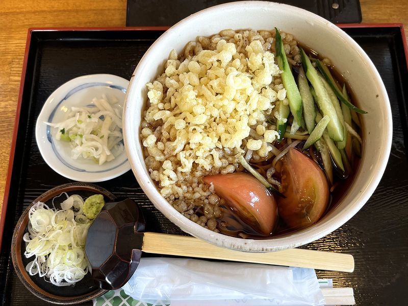 そして具ですが、メインのたぬき部分は、天かすではなくわざわざ作ったと思われる揚げ玉が、あとの方まで香ばしさとサクサク感をキープ。その他は、定番で相性バッチリのキュウリ、そしてこれはあまり見かけないトマトという組み合わせですが、どちらも朝採れでしょうか?フレッシュ感があって、「夏の味」という感じでした。