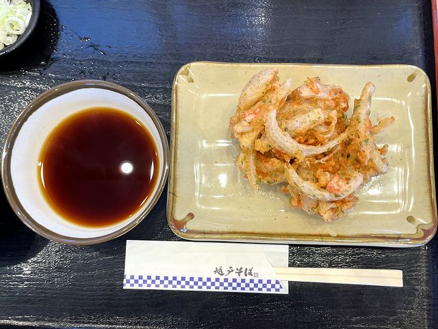 で、やってみたらこれがバッチリハマったというか、かき揚げを温かいツユの器にとってソバと一緒にいただけば、それは紛れもなくヤツ(ひたし・冷やし)だ。天つゆ兼かけ用のツユの塩梅が、ひたし・ひやしにもいける濃さでしたし、もし味濃くしたければ、(多少ぬるくはなりますが)もりそばのツユ足せば良いんだし。ツユの器が小さめなのでまるまる食べきるのは限界があるのですが、気が付いたら、半分くらいその食べ方でいっていました。
