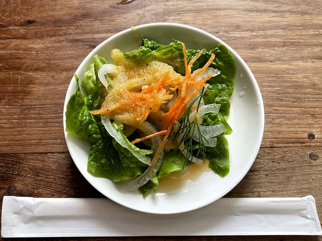 花の季さんの心づけといえば、大根の甘酢漬けが一番登場回数が多いので、それ以外が出たときはラッキー感が強いのですが、今回のサラダも良かったというか、まずお店の農園で採れたと思われる野菜は新鮮で、サラダの大原則の3C(Clean~清浄で、Cool~冷たく、Crisp~歯応えパリっと)が守られているのはもちろん、自家製と思われるドレッシングが、また。あと、添えられたディル?がお洒落で、風味的にもアクセントになっているのではないでしょうか。